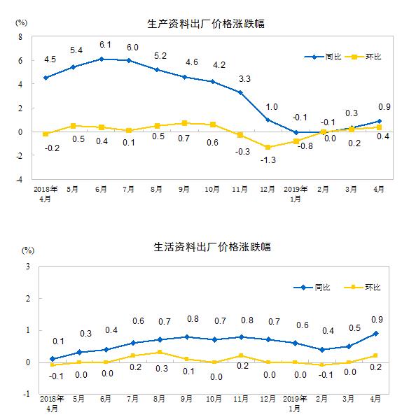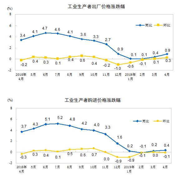 央视网消息:据国家统计局网站消息,2019年4月份,全国工业生产者出厂价格同比上涨0.9%,环比上涨0.3%;工业生产者购进价格同比上涨0.4%,环比下降0.1%。1—4月平均,工业生产者出厂价格比去年同期上涨0.3%,工业生产者购进价格上涨0.2%。