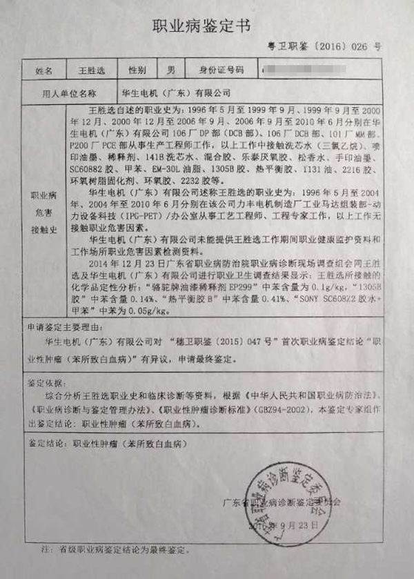 2016年9月,广东省职业病诊断鉴定委员会最终综合分析王胜选职业史和临床临床诊断等资料,并依据《中华人民共和国职业病防治》、《职业病诊断与鉴定管理办法》等,做出鉴定结论为职业性肿瘤(苯所致白血病)。