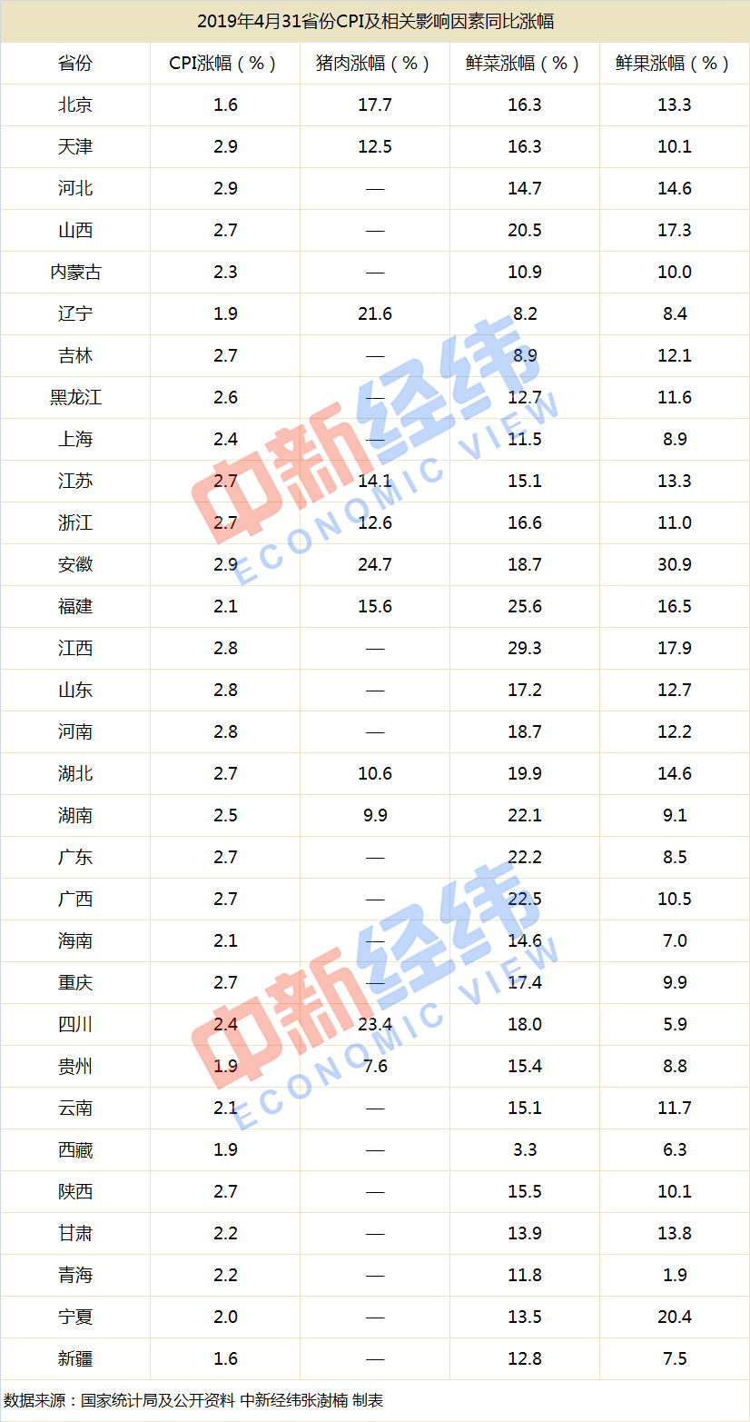 中新经纬客户端5月23日电 (张澍楠)全国31省份2019年4月CPI数据相继出炉,“蒜你狠”“车厘子自由”“香椿自由”等热议话题近期也重回大众视野,在菜价、水果价的强势围攻下,各省CPI又有何表现?