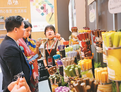 在日前举行的2019年中国品牌日活动上,工作人员(右)向观众介绍以食物残渣为主要原料制作笔身的可降解中性笔。