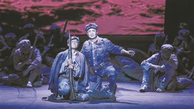 当晚的演出,大幕开启,红军的大合唱立即就把现场观众带入了那一段峥嵘岁月。从红军告别瑞金、湘江战役、遵义会议,到飞夺泸定桥、翻雪山、过草地、会宁胜利会师,歌剧《长征》通过红军战士和普通民众的视角,串联出长征途中的重要节点事件,以史诗般的气魄描绘出红军长征的壮阔画卷。而彭政委、曾团长、平伢子、洪大夫等剧中人物闪烁着人性光辉,高举着理想与信念,勇往直前百折不挠,向观众再现了那一场“伟大的行走”。