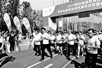 活动现场,环保人士、“北京榜样”代表、运动员代表、阿里巴巴集团代表等共同发出了低碳环保倡议,倡议所有人行动起来,积极宣传普及绿色办奥理念和低碳环保知识,踊跃参与全民低碳行动。随后,“奔向2022 绿色起跑 全民开动”2019国际奥林匹克日冬奥主题活动暨北京世园会公益跑活动启动,近千名跑者在北京世园会的跑道上挥洒汗水,用奔跑来支持北京冬奥会绿色低碳的目标。摄影/本报记者 林辉