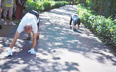 继暴走、倒行之后,“爬行健身”又成为公园健身一景。公园晨练队伍中,戴着手套的大爷大妈们三五成群,手脚着地、腰背拱起,缓慢爬行,引得人们好奇围观。