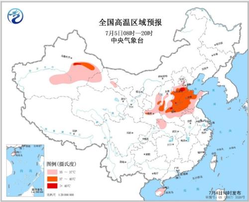 中新网7月4日电 据中央气象台网站消息,中央气象台7月4日18时继续发布高温黄色预警:预计7月5日白天,河北中南部、山西中南部、陕西东部、山东、河南中北部、甘肃西部、新疆东部和南疆盆地等地最高气温达35~37℃。