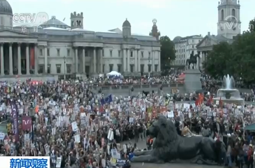 抗议人群中,有人反对美国对英国内政的粗暴干涉。眼看着特雷莎·梅因脱欧问题在首相位置上“去日无多”,美方开始在英国首相继任人选问题上评头论足,称英国前外交大臣约翰逊将成为一位“出色的首相”。这一言论在英国引发批评声浪。