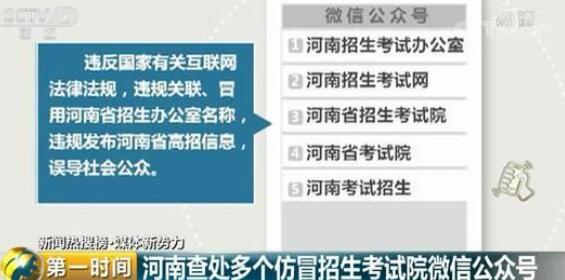 据河南省网信办通报称,在今年高考结束后接到群众举报,在微信平台搜索到的“河南招生考试办公室”、“河南招生考试网”、“河南省招生考试院”、“河南省考试院”、“河南考试招生”5个微信公众号违反国家有关互联网法律法规,违规关联、冒用河南省招生办公室名称、标识,违规发布河南省高招信息,误导社会公众。据了解,河南省招生考试院并没有开通官方的微信公众号。