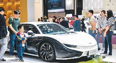 在2019第九届贵阳国际汽车展上,观众参观正在参观展览车辆。刘朝富摄(人民图片)