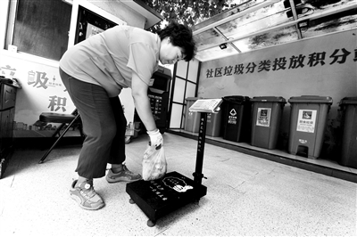 在石景山沁山水小区南区,垃圾分类指导员对居民投放的厨余垃圾进行称重,居民可获得积分奖励 摄影/本报记者 袁艺