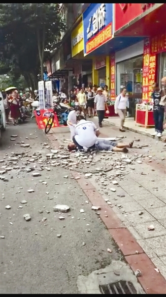 7月25日10时30分左右,四川省宜宾市兴文县古宋镇(县城)东门口胜利南街11号门柱下,68岁的兴文太平镇村民陈从彬被头顶突然掉落的墙体脱落物砸中头部,应声倒地血流如注。