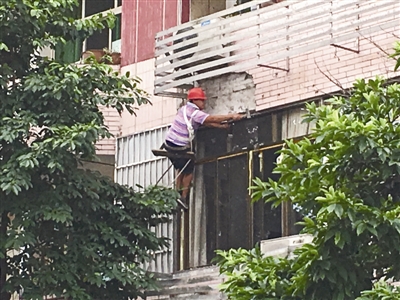记者看到,工人通过保险绳爬上外墙,对出现隐患的瓷砖进行敲打。工人落锤处,由瓷砖和水泥构成的墙皮应声而落。记者注意到,脱落伤人的墙皮本在四楼,经工人处理,相连的三楼墙皮也被剥离。目击者告诉记者,最先脱落的墙皮宽约1.2米、长约2米,直接砸中陈从彬头部。