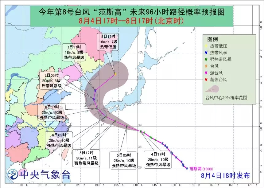目前,西北太平洋上共有2个台风存在,另一个是今年第8号台风“范斯高”。据预计,“范斯高”将以每小时25公里左右的速度继续向西偏北方向移动,逐渐向日本以南洋面靠近,强度逐渐加强,最强可达台风级(12级,33-35米/秒),之后在朝鲜半岛附近逐渐转向东北方向移动,强度逐渐减弱。未来两天,“范斯高”对我国近海海域无影响。
