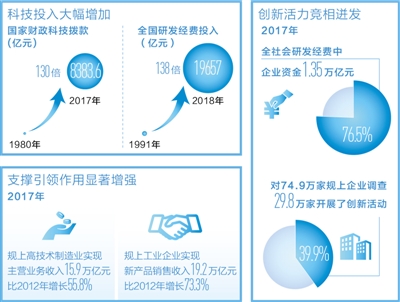 2017年,我国研发经费中企业资金达到1.35万亿元,占全社会研发经费支出的76.5%。对74.9万家规模以上企业开展的调查显示,有29.8万家当年开展了创新活动,占比达39.9%。截至2018年底,我国已累计认定国家级企业(集团)技术中心1480家。企业这支生力军正在迸发出更加强劲的创新创造活力。