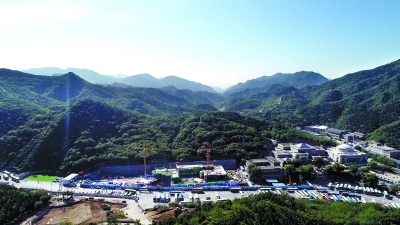 俯瞰八达岭站,站顶正在进行最后的封顶作业。右后侧山顶可以看到长城烽火台。