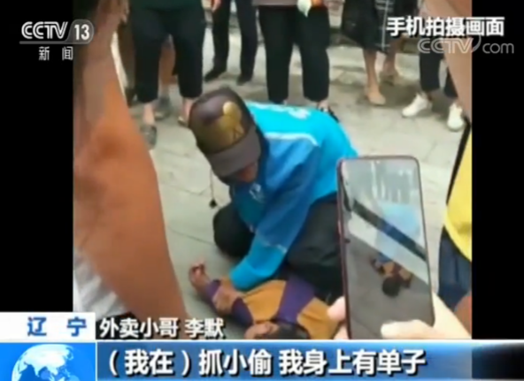 外卖小哥 李默:当时他有点反抗,想跑,我防止他跑,第一时间给他控制住,给他放倒了。他借助人群比较乱又起来了,我再次又给他来一个过肩摔放倒了,放倒以后给他控制住了。