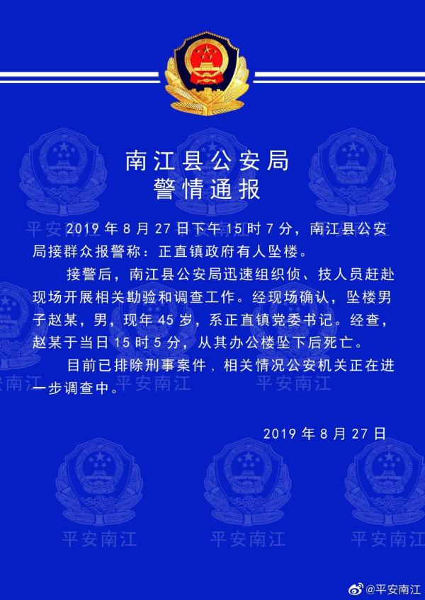 据四川省南江县公安局官方微博8月27日消息,27日15时5分,正直镇党委书记赵某从其办公楼坠下后死亡。目前,已经排除刑事案件,相关情况正在进一步调查中。