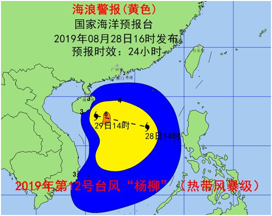 海浪方面:预计8月28日夜间到29日白天,南海中部将出现4到6米的巨浪到狂浪,近海海浪预警级别为黄色;海南东部、南部近岸海域将出现2.5到3.5米的大浪,海浪预警级别为黄色;广东西部近岸海域将出现1.5到2.5米的中浪到大浪,海浪预警级别为蓝色。国家海洋预报台提醒,在上述海域作业的船只注意安全,沿海各有关单位提前采取防浪避浪措施。