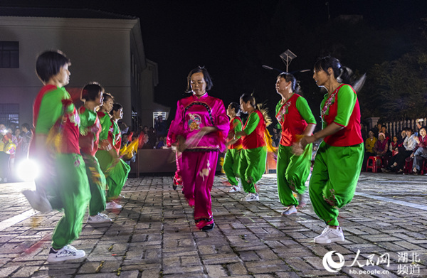 华灯初上时,北峰村群众文化活动中心广场上的音乐也按时响起,文艺志愿者王宗凤又开始了教村民跳广场舞的工作。藤缠树、凤凰展翅、观音坐莲……北峰村的广场舞带着强烈的地域特色,显得与其它地方不同。这是当地非遗“地花鼓”中的一些基本招式,王宗凤和传承人郝大庆一起将之编排进广场舞中,教授给当地村民。