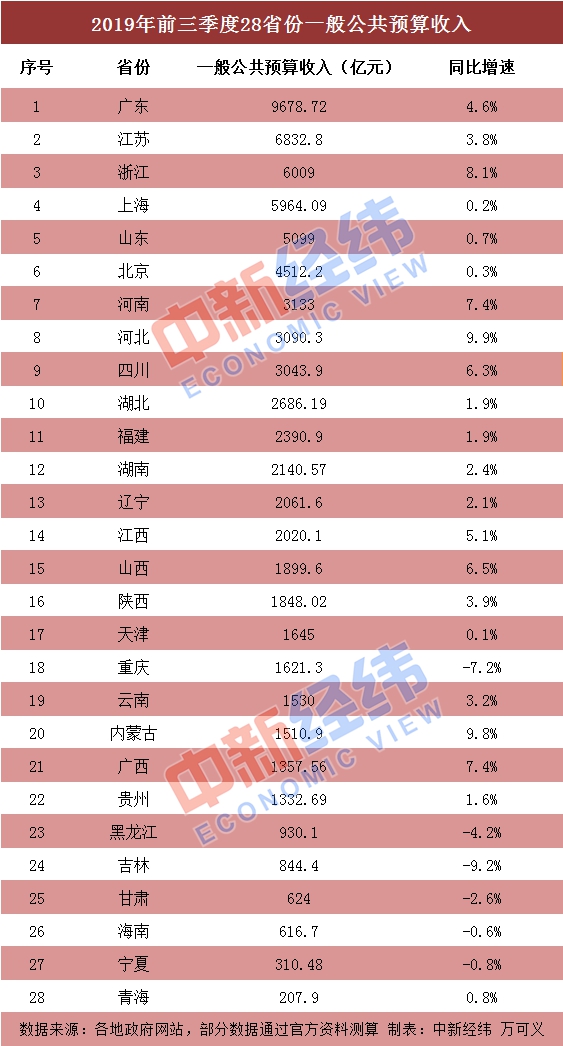 从总量上来看,前三季度广东省一般公共预算收入完成9678.72亿元,居28省份之首,领先第二名江苏省(6832.8亿)达2800多亿。