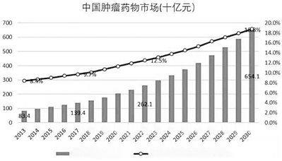 2013年至2017年间我国抗肿瘤药物的市场规模稳步增长,市场规模由834亿元增长到1394亿元,占中国医药市场百分比由8.4%提升至9.7%。根据弗若斯特沙利文咨询公司(Frost&Sullivan)的预测,2022年至2030年我国抗肿瘤药物市场年均复合增长率约为12.1%,2022年、2030年抗肿瘤用药市场销售额分别可达2621亿元和6541亿元。图片来源于网络
