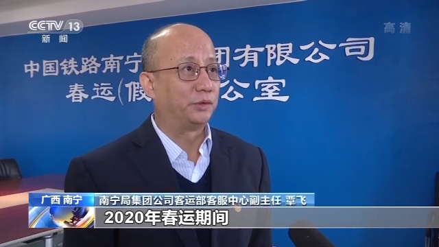 南宁局集团公司客运部客服中心副主任 覃飞:2020年春运期间,针对粤、桂、黔三地返乡务工流,西南地区连接珠三角的南广、桂广高铁再次发力,客流高峰期南广线首次取消了夜间施工天窗,桂广线也取消了夜间施工天窗,每天开行动车突破了100对。