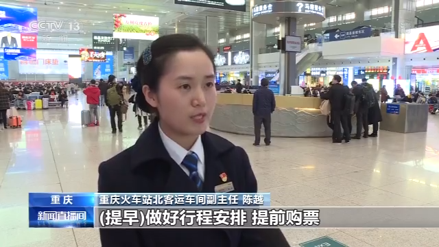重庆火车站北客运车间副主任 陈越:由于春运期间返程客流较为集中,在此提醒广大旅客提早做好行程安排,提前购票。