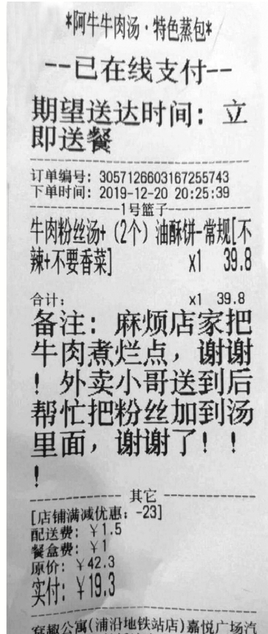 担心老人咬不动,单子上特意叮嘱:“麻烦店家把牛肉煮烂点,谢谢!外卖小哥送到后把粉丝加到汤里面,谢谢了!配送的地点,浦沿地铁站嘉悦广场附近一座桥边。”