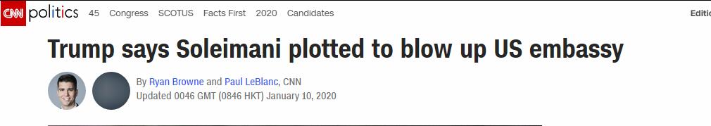 据CNN报道,当天晚些时候,一名美国高级国防官员支持了特朗普的这一说法。该官员对记者说:美国掌握了有关苏莱曼尼的多个阴谋与威胁的情报,其中一起涉及使用炸药袭击大使馆的计划。