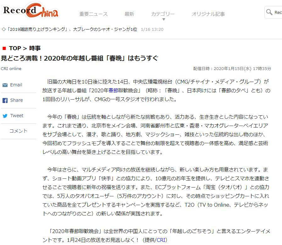 日本最大的中国新闻网站Record China、日本最大的视频网站Niconico、日本信息门户类网站Biglobe News都发布了《看点满满!2020年 “春晚”进入倒计时》的报道。