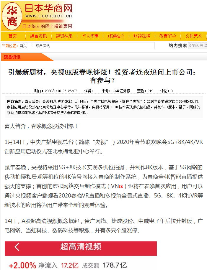 境外媒体还惊呼:央视5G/8K春晚引爆中国春晚概念,大批超高清概念股票持续上扬,“中国在5G、8K领域的优势已越来越强劲。”