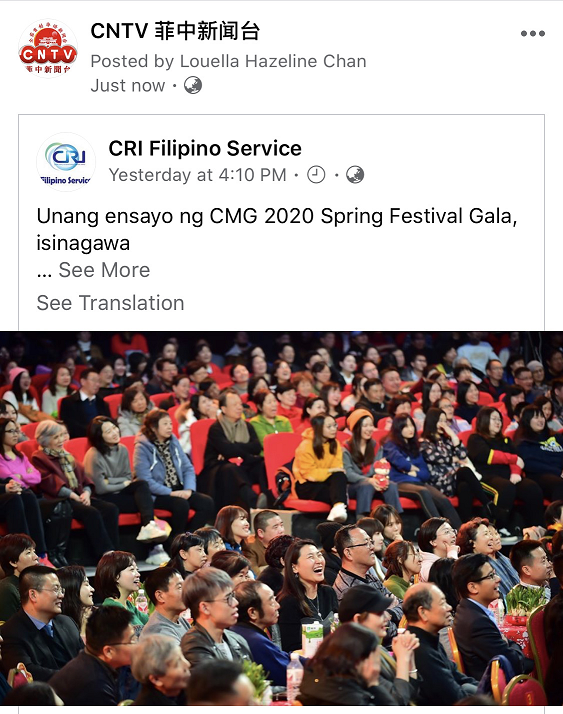 菲律宾菲中新闻台在其社交媒体Facebook账号发布称,1月14日,中央广播电视总台 2020春晚进行首次彩排,超过600名观众观看了这次彩排。