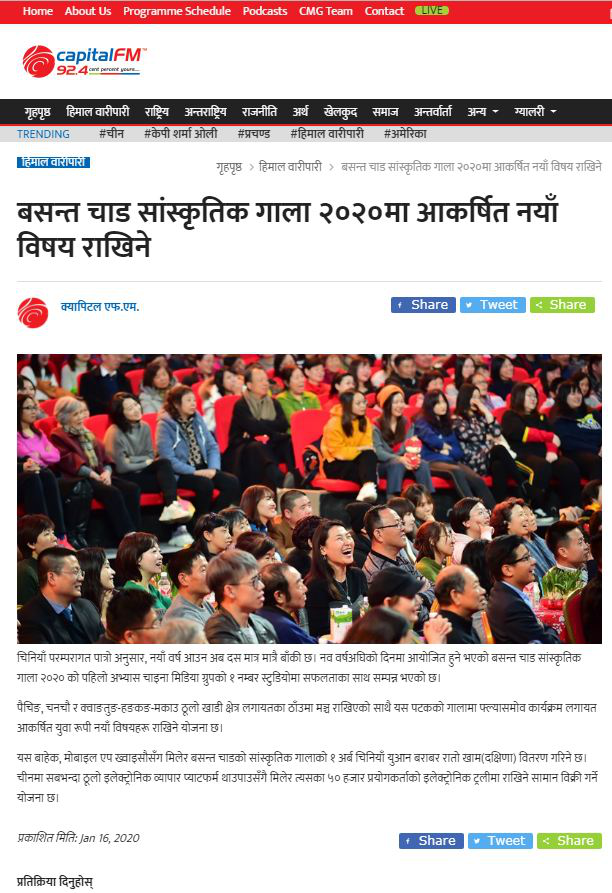尼泊尔首都加德满都的都市调频92.4电台网站1月16日报道称, 2020年春节联欢晚会北京主会场的舞美设计堪称别具匠心,传达出“景观性”美学精神和意蕴。