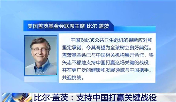 盖茨说,中国对此次公共卫生危机的果断应对和坚定承诺,令其有望为全球树立良好典范。盖茨基金会已与中国相关机构展开合作,将矢志不移地支持中国打赢这场关键的战役,并在更广泛的健康和发展领域与中国携手、共迎挑战。