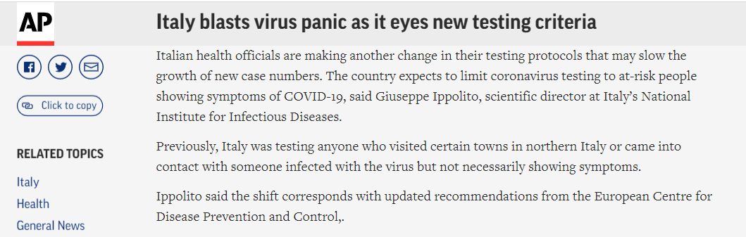 除此之外,为了放缓确诊的增速,意大利对检测标准作出了另外一项重大调整,将只会检测出现症状的高风险人群。此前,意大利的病毒检测是对所有来自意大利北部一些疫情集中地,以及与确诊者有密切接触的人开放的,哪怕这些人没有出现症状。