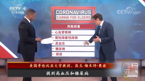 美国哥伦比亚大学教授、医生 梅米特·奥兹:第一大危险因素是心血管疾病、动脉硬化。特别是曾有心脏病或中风之类疾病的人,然后是慢性阻塞性肺病、高血压、糖尿病和癌症,提到高血压和糖尿病,美国很大比例的人都有这些疾病。