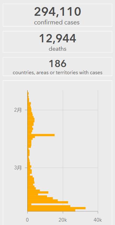 世卫组织实时统计数据显示,截至欧洲中部时间3月22日17时59分(北京时间23日0时59分),全球确诊新冠肺炎294110例,死亡12944例,目前全球已有186个国家和地区出现新冠肺炎病例,中国以外新冠肺炎确诊超过21万例。(总台记者 朱赫)
