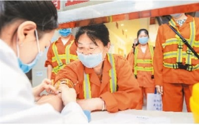 5月3日,环卫工人正在重庆市沙坪坝区一医院接受采血检查。张锦辉摄(人民视觉)