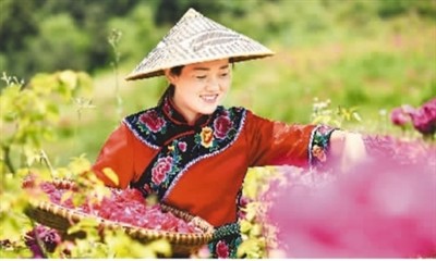 5月3日,村民在贵州省铜仁市松桃苗族自治县黄板镇腊冲村玫瑰产业园采收玫瑰花。龙元彬摄