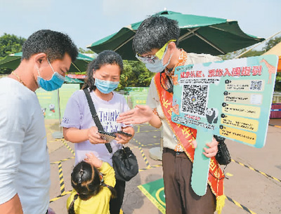 广州长隆野生动物世界恢复开放,实施线上预约、健康登记、体温监测等多项管理措施。图为工作人员在门口指引游客出示健康码。新华社记者 刘大伟摄