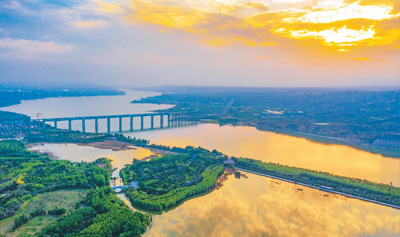 4月17日,夕阳下的河南三门峡黄河湿地,水面清澈,宛如展现在大地上的一面镜子。杜 杰摄(人民视觉)