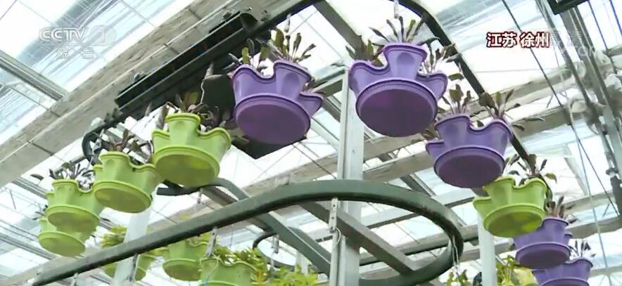 江苏省徐州市铜山供电公司棠张供电所营销员 赵慕天:这是我们的追光技术,通过电驱动可以使花盆进行旋转,可以使每一束花受到阳光均匀照射,可以看到这是我们用了三层的架子,相当于提高三倍的土地使用率。