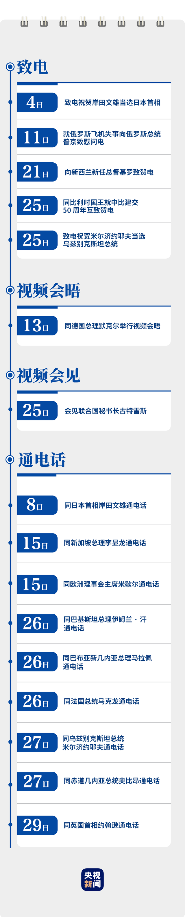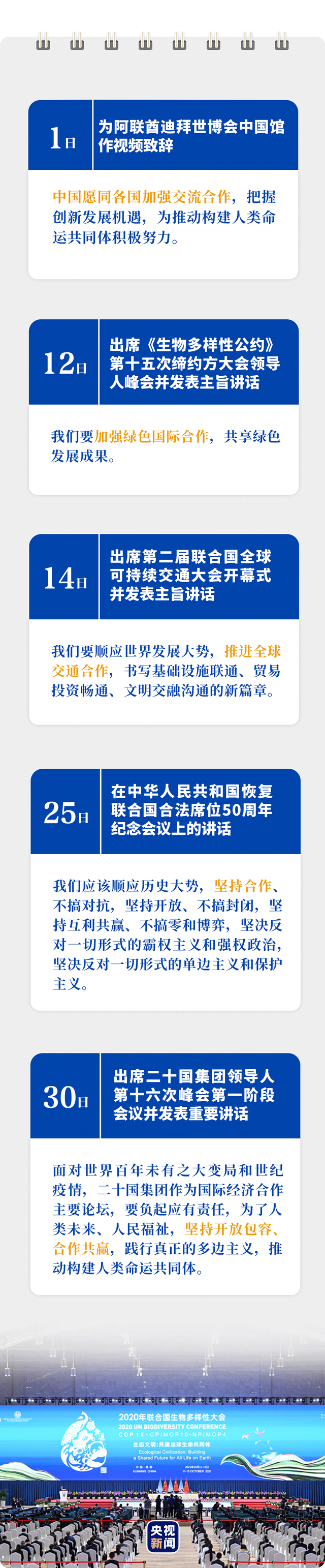 在纪念辛亥革命110周年大会上,高度评价辛亥革命的历史功勋,呼吁海内外全体中华儿女携手向着民族复兴的目标继续奋勇前进;来到黄河入海口,部署推进黄河流域生态保护和高质量发展的国家战略;参观国家“十三五”科技创新成就展 ,对广大科技工作者提出殷切期盼;开展多次“云外交”,阐明中国主张……习近平高瞻远瞩,话语铿锵。
