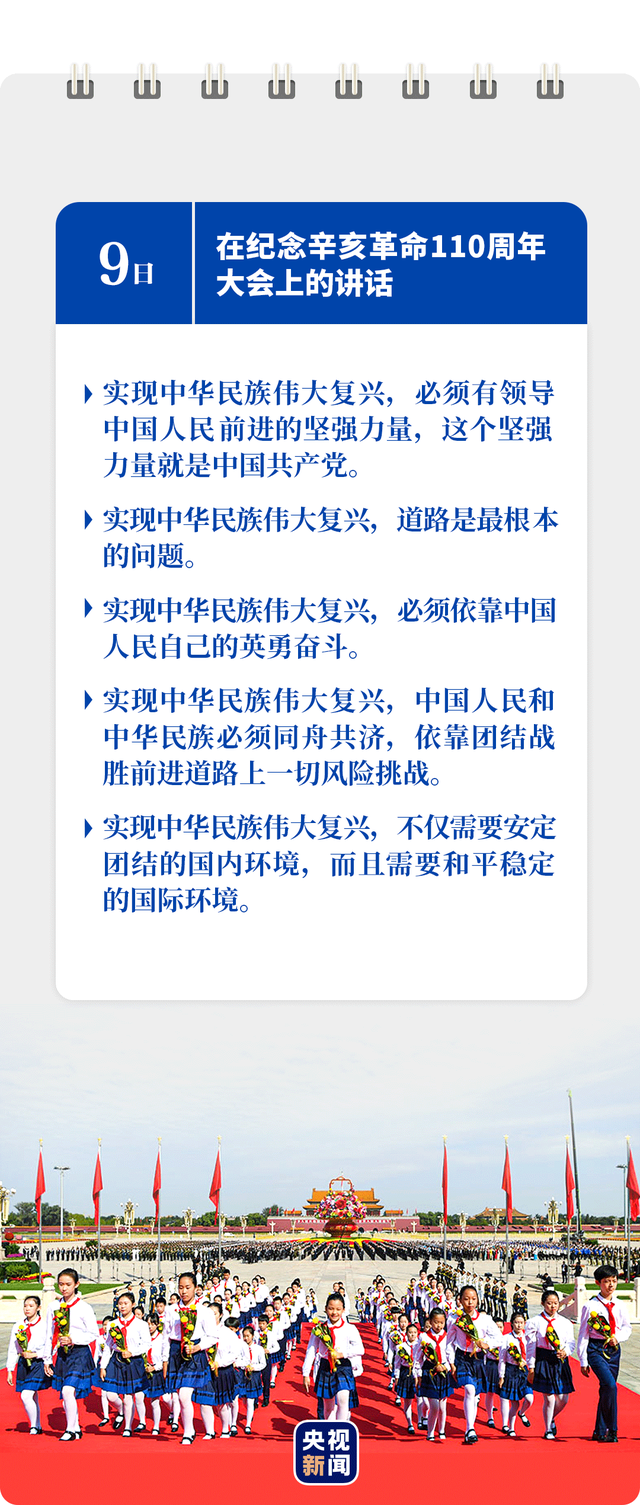 在10月9日的纪念大会上,习近平总结了辛亥革命110年来的5点历史启示——