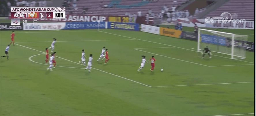 面对老对手韩国队,半决赛因伤缺阵的王霜首发亮相。开场后,身穿红色队服的中国队稍占上风,几次将球输送到对方禁区,威胁对方大门。然而,第27分钟,韩国队后场抢断后立即转入进攻,经过几脚快速传递后,由崔有利门前包抄破门,帮助球队1比0取得领先。上半场结束前,中国队被判罚点球,韩国队将比分优势扩大为2:0。