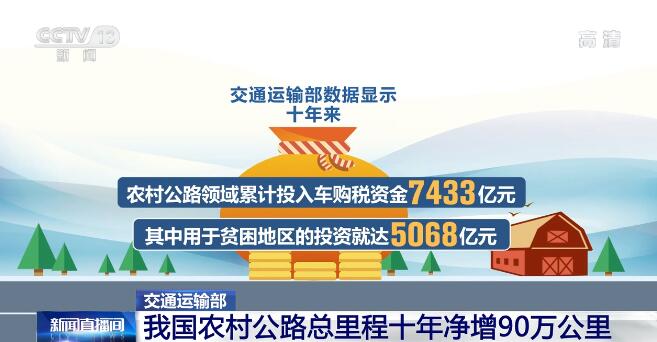 交通运输部数据显示,十年来,中央在农村公路领域累计投入车购税资金7433亿元,其中用于贫困地区的投资就达5068亿元,累计新改建农村公路约253万公里,解决了1040个乡镇、10.5万个建制村通硬化路的难题。农村公路的总里程从2011年底的356.4万公里增加到2021年底的446.6万公里,十年净增了90多万公里。十年来,改造农村公路危桥超6万座,实施安全生命防护工程超127万公里。