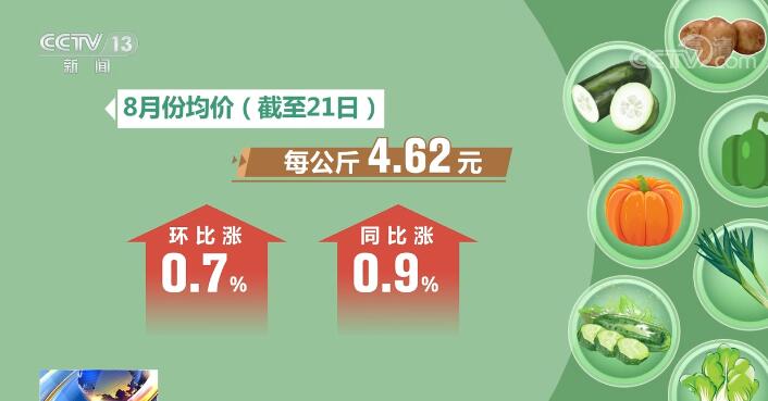 农业农村部8月20日重点监测的28种蔬菜平均价格为每公斤4.74元,比8月1日上涨1.3%。截至21日,蔬菜8月均价为每公斤4.62元,环比涨0.7%,同比涨0.9%。