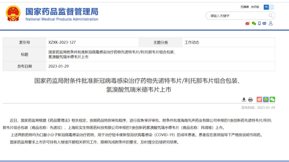 今天(1月29日),位于江苏南京的药企先声药业发布消息,该公司与中国科学院上海药物研究所、武汉病毒研究所联合开发的抗新冠病毒创新药先诺欣(先诺特韦片/利托那韦片组合包装)获国家药品监督管理局(NMPA)按照药品特别审批程序,进行应急审评审批,附条件批准上市。
