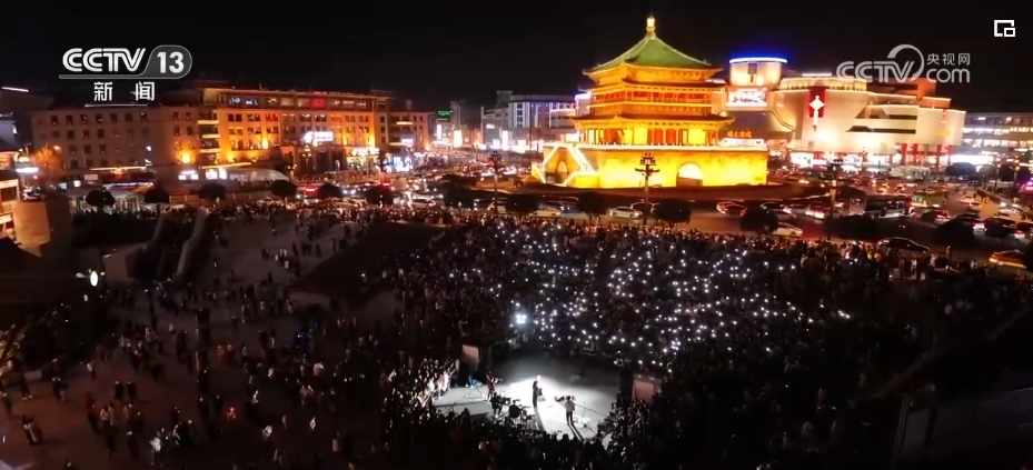 在西安市中心的钟楼旁,人们坐在下沉广场的台阶上,点亮手机的灯光,与五湖四海的朋友一起大合唱,这是独属于西安的浪漫。
