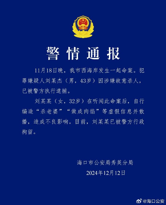 央视网消息:据@海口公安 消息,11月18日晚,海口市西海岸发生一起命案。犯罪嫌疑人刘某杰(男,43岁)因涉嫌故意杀人,已被警方执行逮捕。