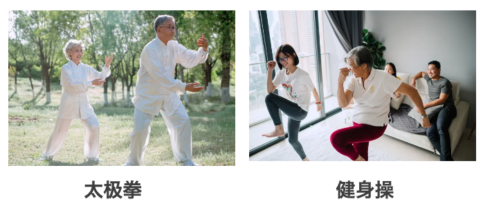 太极拳、健身操、老年舞蹈等,提高协调性,延缓关节老化。