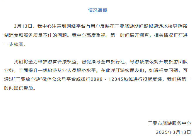 央视网消息:据三亚市旅游服务中心微信公众号消息,3月13日,三亚市旅游服务中心注意到网络平台有用户反映在三亚旅游期间疑似遭遇地接导游强制消费和服务质量不佳的问题。中心高度重视,第一时间展开调查,相关情况正在进一步核实。中心将全力维护游客合法权益,督促指导全市旅行社、导游依法依规开展旅游团队业务,全面提升一线旅游从业人员服务水平。在此呼吁游客朋友们,如遇相关问题,可通过“三亚放心游”微信公众号平台或拨打0898 - 12345热线进行投诉反馈,中心将第一时间提供帮助。